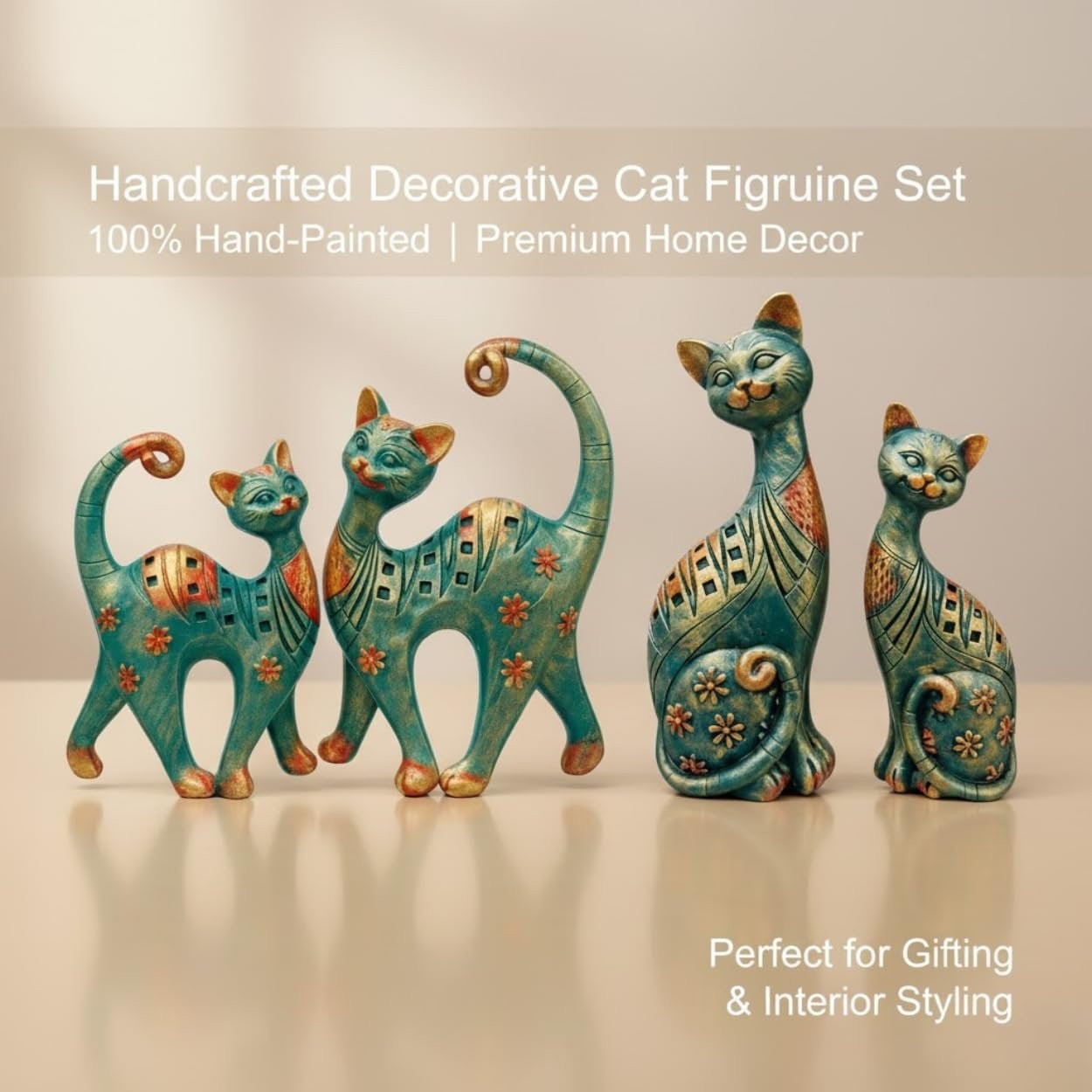 Handcrafted Decorative Cat Figurine Set – Teal Green & Antique Gold Resin Showpieces