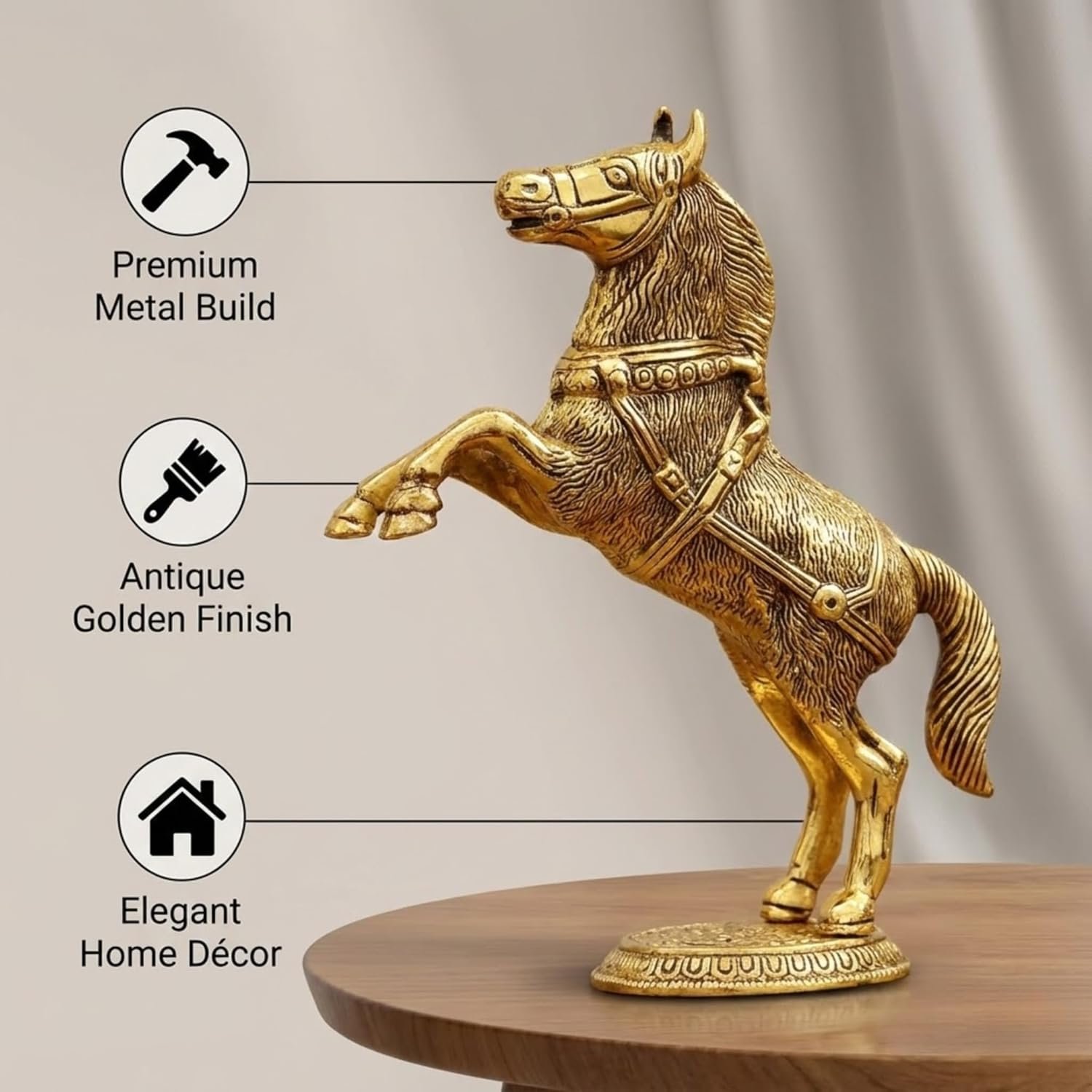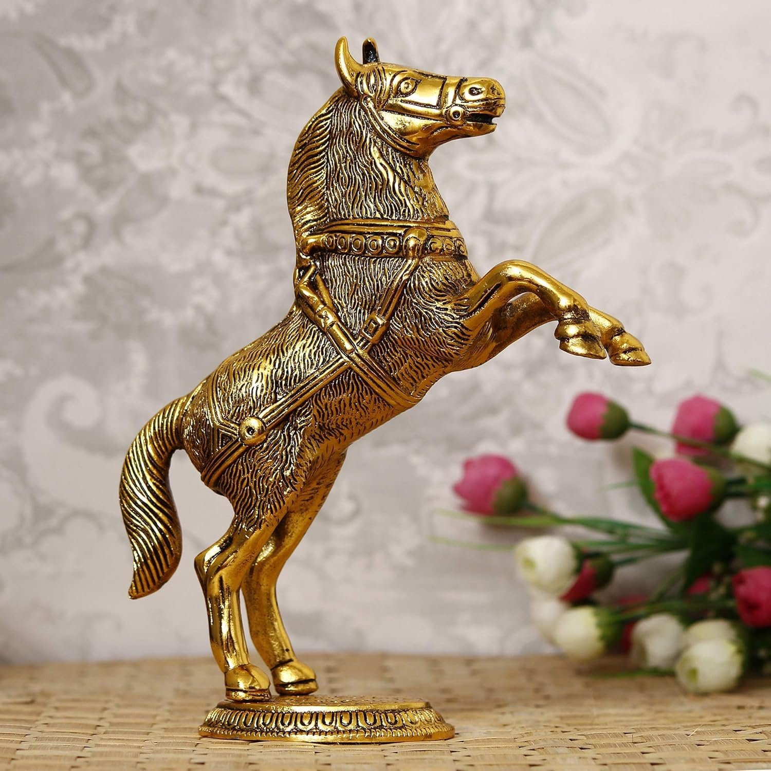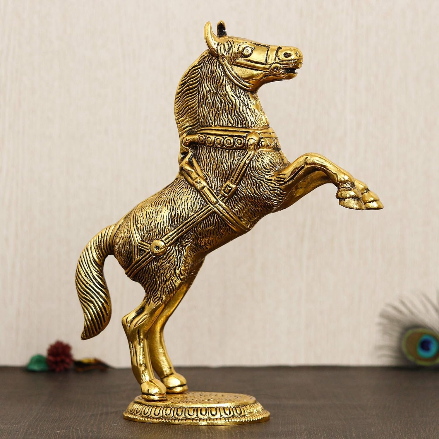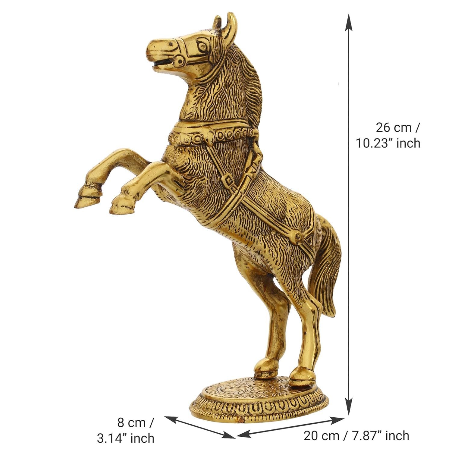 Crafted with intricate detailing and a polished antique-inspired finish, this horse figurine showcases motion and power through its uplifted posture. The textures and contours of the metal statue are carefully highlighted, giving the piece a premium handcrafted appearance that resonates with both contemporary and traditional interiors. Its dynamic design ensures it becomes an eye-catching focal point, whether displayed on a console table, bookshelf, or your office desk.